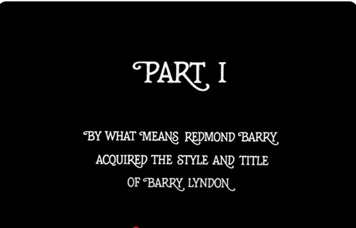 ![]() Sia Barry Lyndon (Stanley Kubrick, GB-USA 1975) che La storia di mia moglie/A feleségem története (Ildikó Enyedi, Ungheria-Germania-Francia-Italia 2021) sono suddivisi in "capitoli", ciascuno con un titolo, come se l'intenzione del regista fosse di segnalare ai suoi spettatori che, come in un libro, si sta narrando una storia, e che quindi c'è da aspettarsi una scansione ben definita degli eventi. |